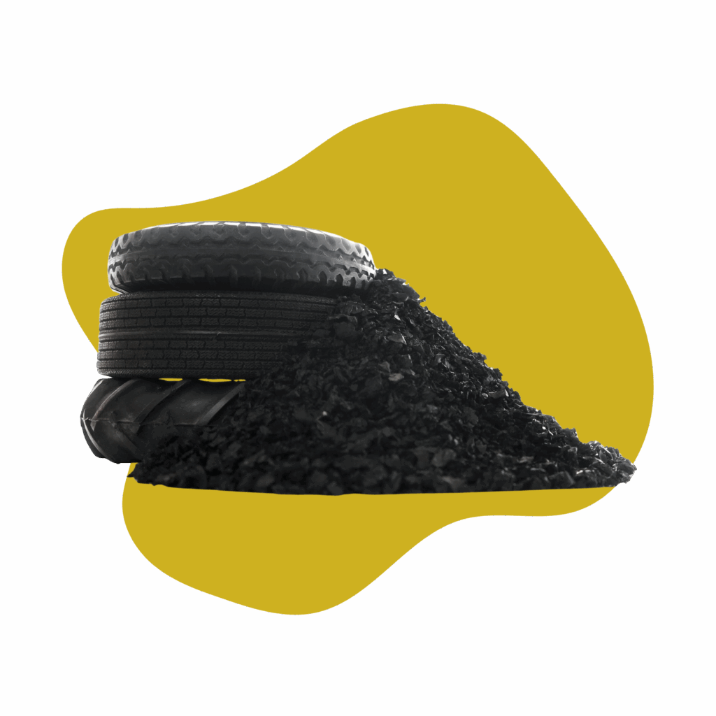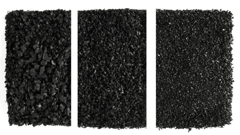 Caucho granulado de diversos tamaños y aplicaciones.